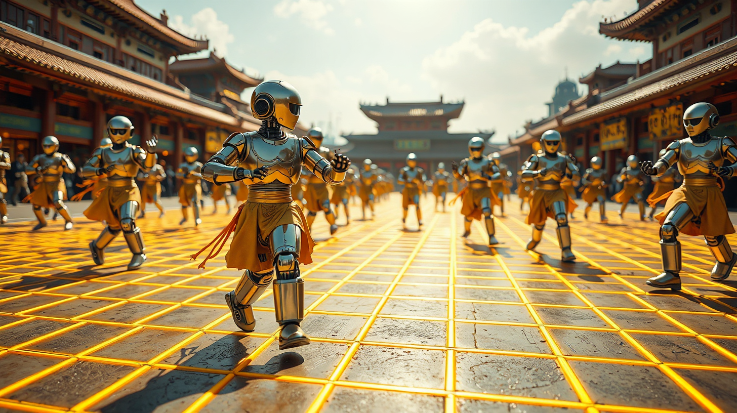 作图提示词:A Shaolin computing square in Zhengzhou, where AI martial monk robots demonstrate urban emergency systems. Golden energy grids emerge on the ground as they move. Low-angle shot focusing on the intricate patterns of kinetic energy conversion, with warm yellow lighting contrasting against cool metallic surfaces. Cinematic lighting with chiaroscuro effects to highlight the robots’ movements, and a slightly desaturated color grade to enhance the futuristic feel.