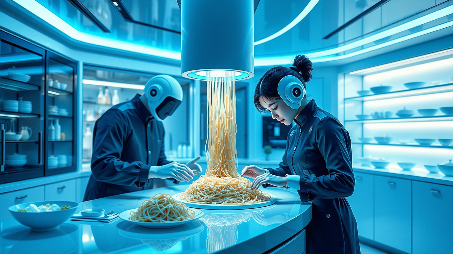 作图提示词:A futuristic transparent kitchen featuring advanced molecular gastronomy technology, meticulously crafting a modern interpretation of traditional Hui noodles with precision. The scene is bathed in soft blue ambient lighting, accentuating the intricate details of the noodle formation process. The atmosphere is ultra-clean and high-tech, with a sleek minimalist design. Cool tones dominate the color palette, enhanced by vibrant blue accents, evoking a sense of cutting-edge innovation.