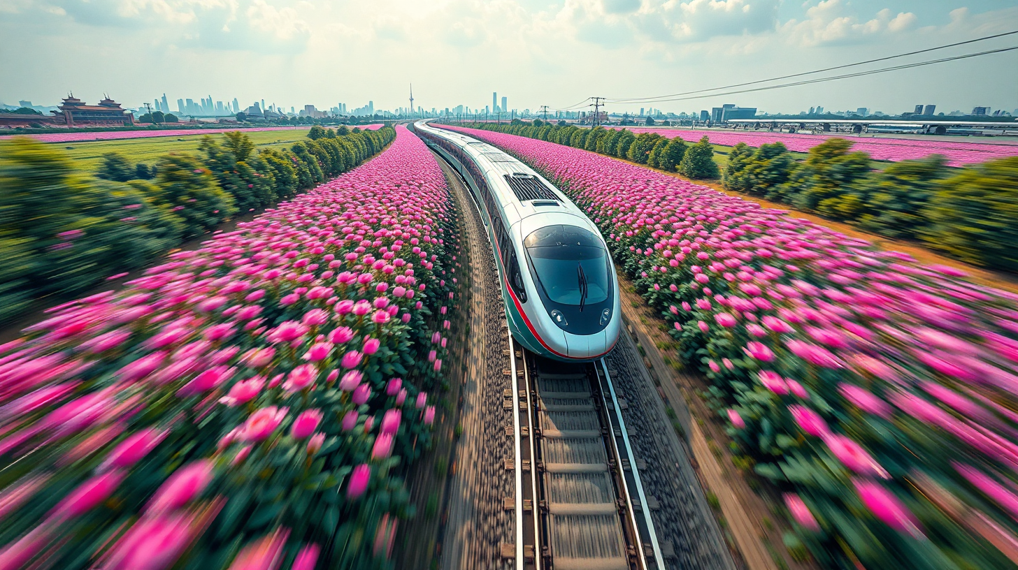 作图提示词:A maglev transit line in Zhengzhou, surrounded by fields of mechanical peonies that transform into brilliant color waves as the train passes. Each blossom contains micro-ecological sensors. Aerial view tracking the moving train, with vibrant pinks and purples contrasting against silver tracks. Shot with a high dynamic range (HDR) to capture the vivid colors and metallic reflections, using motion blur to emphasize speed.