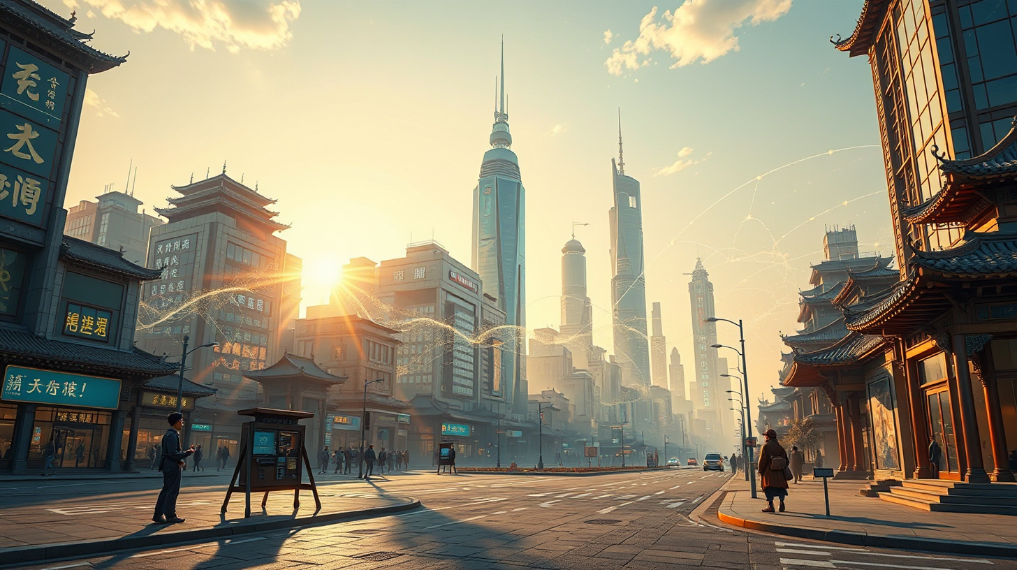 作图提示词:A futuristic city skyline of Zhengzhou at dawn, featuring holographic oracle bone script weaving a quantum light network across building facades, ancient bronze tripod terminals standing at street corners, soft golden morning light casting long shadows, vibrant data streams blending with traditional motifs. Ultra-wide shot from a low angle showing the gradual illumination of the quantum network, with a cinematic color palette of warm golds and cool blues, emphasizing depth of field and dramatic lighting contrasts.