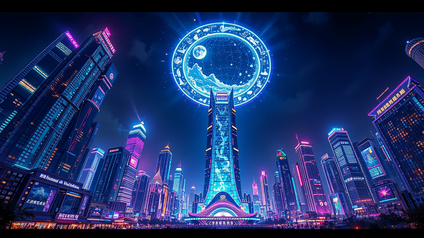 作图提示词:A breathtaking nocturnal panorama of Zhengzhou’s futuristic Zhengdong New District, where towering skyscrapers are crowned by an enormous holographic ring displaying the progression of Chinese civilization. Captured from a dramatic low-angle perspective to emphasize the city’s monumental scale and the celestial projection. The lighting combines dynamic neon urban glow with the ethereal luminescence of the holographic ring, creating a vibrant cyberpunk atmosphere. The color scheme features deep sapphire blues and royal purples contrasted with brilliant luminous highlights.