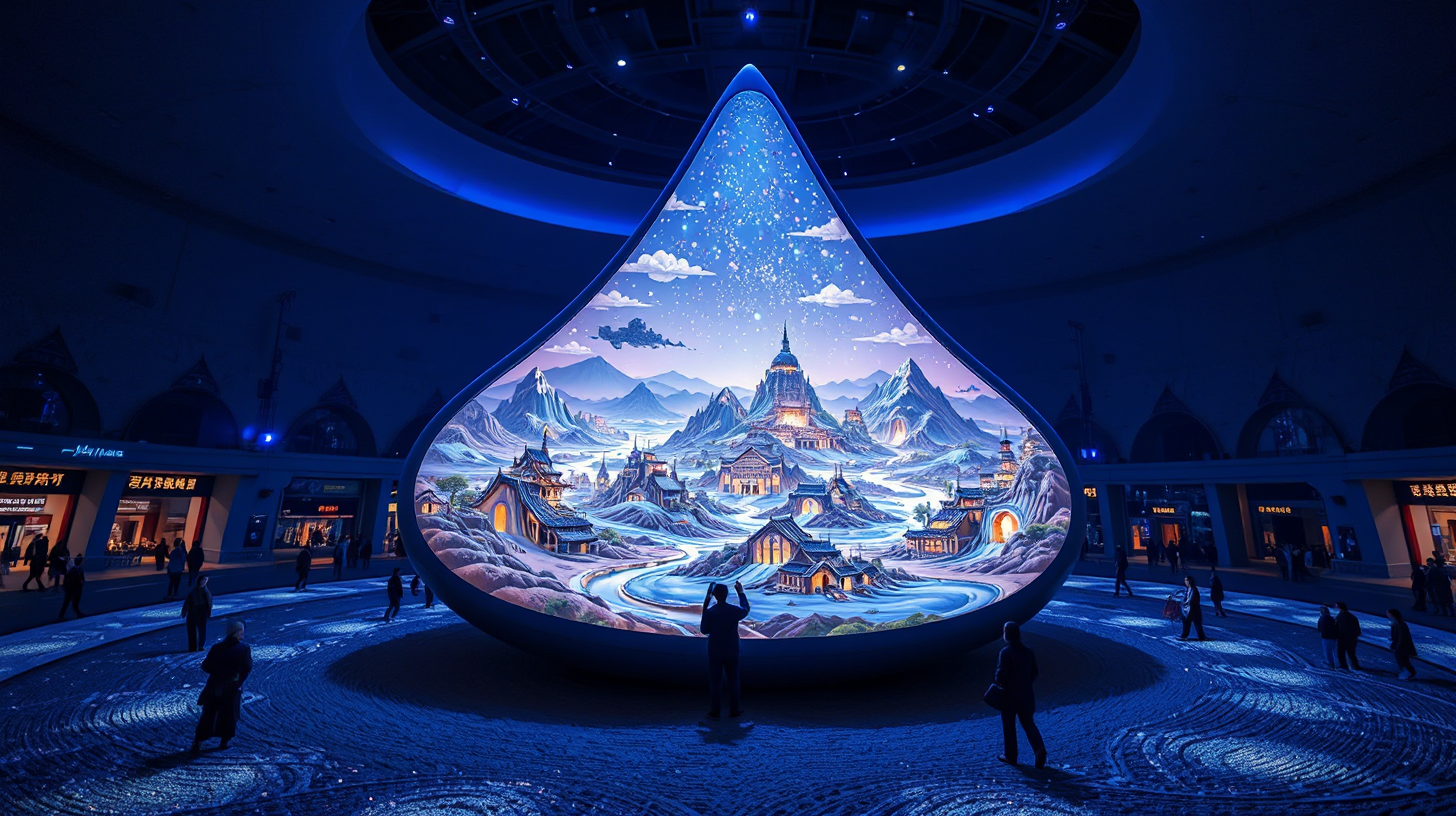 描述:城市中心悬浮着反重力水滴状文化中枢,透明外壳折射出冷蓝色光晕。内部数千个纳米沙粒投影仪正演绎黄河文明史诗,金色光沙如液态星河流淌,重现“黄河之水天上来”的壮阔。光沙在半空凝聚成大禹治水的立体图景,让五千年文明记忆在科技光影中永恒流动。
