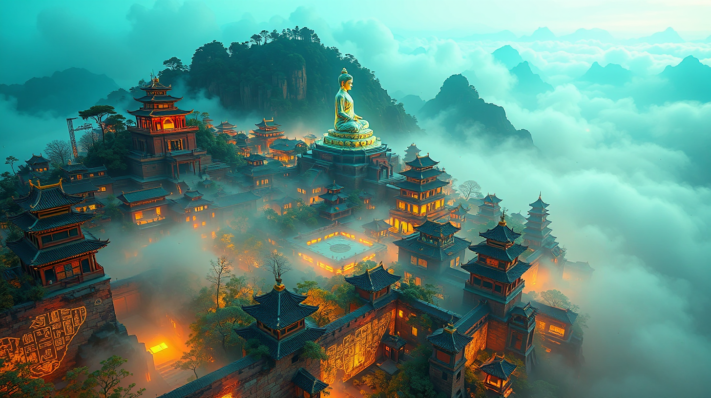作图提示词:A breathtaking aerial view of Leshan city emerging from morning mist, ancient buildings covered in glowing golden patterns synchronized with the Leshan Giant Buddha, nanotech-enhanced bioluminescent vegetation between cracks of ancient city walls projecting dynamic holographic scriptures, ethereal atmosphere with volumetric fog, cinematic chiaroscuro lighting, ultra-detailed 8K resolution, hyper-realistic textures, vibrant jade and gold color palette, futuristic Sino-cyberpunk style with traditional architectural elements