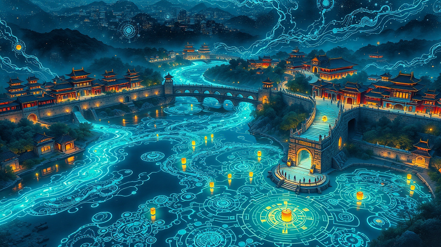 作图提示词:A mesmerizing aerial view of the ancient city wall park at night, where streams of glowing energy flow like a galaxy through the confluence of three rivers. Children release electronic lanterns carrying futuristic visions into the water, their reflections merging with the luminous archaeological nanobots repairing Ming Dynasty brick carvings. The scene combines traditional Chinese architectural elements with futuristic energy flows, creating intricate patterns of light on the water’s surface. Ultra-detailed, cinematic night scene with deep blues and vibrant energy hues, blending historical preservation with technological wonder.