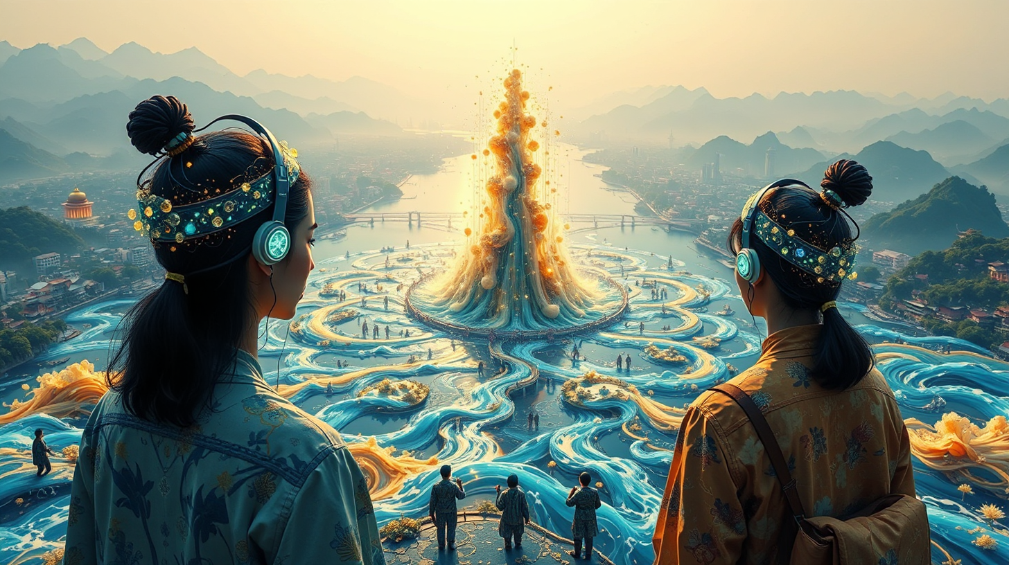作图提示词:A mesmerizing wide-angle view of the Minjiang, Qingyi and Dadu rivers’ confluence, with a holographic water matrix rising from the intersection, citizens wearing neural headbands with glowing interface nodes to choreograph water flows that weave luminous historical epics of Bashu culture across the river surface, ultra-detailed fluid dynamics simulation, vibrant sapphire and golden hues, futuristic yet rooted in traditional Chinese ink wash aesthetics, cinematic anamorphic composition with dynamic symmetry