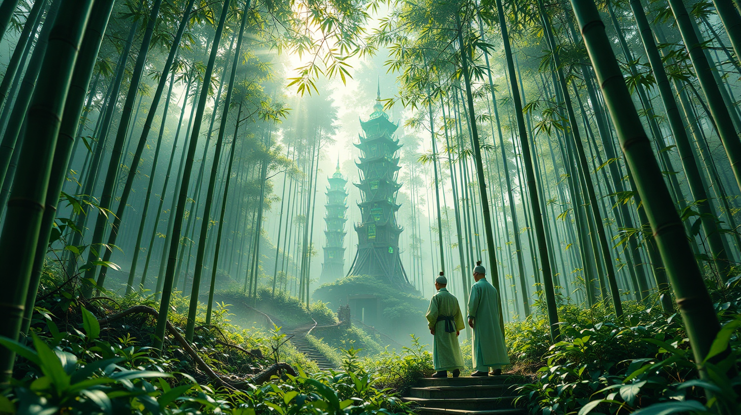 作图提示词:A majestic low-angle shot through the bamboo forest at Emei Mountain foothills, with fractal-based topological towers emerging through organic growth patterns among the bamboo, retired engineers in smart hanfu supervising maintenance drones that harvest bamboo fibers for bio-computer chips, the scene features ultra-detailed vegetation with subsurface scattering, glowing emerald tech interfaces integrated into natural forms, cinematic mist diffusion with god rays, a harmonious wabi-sabi fusion of Song dynasty aesthetics with quantum biotechnology