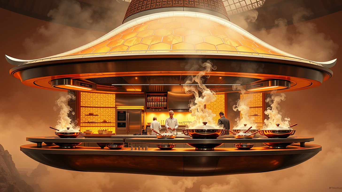 作图提示词:A medium close-up view of a floating molecular Sichuan cuisine kitchen, with emotion algorithm architects wearing data-gloves to adjust quantum spice simulators, the ultra-modern floating structure incorporates curved eaves and latticework from Song dynasty architecture, warm amber lighting from bioluminescent panels highlights the chrome kitchen equipment, aromatic steam rising from induction woks with precise thermal halos, hyper-detailed material textures showing brushed metal and ceramic composites, futuristic gastronomy concept with traditional wuxia ambiance