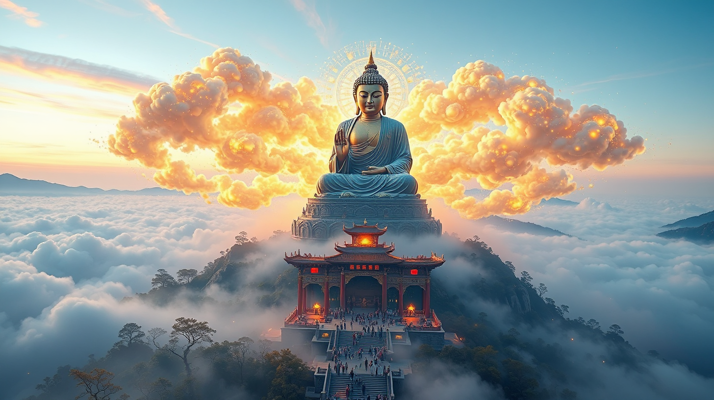 作图提示词:A breathtaking panoramic view of Mount Emei’s sea of clouds during the annual city-wide brainwave resonance festival. Golden quantum dewdrops shimmer as they are released from the palm of Leshan Giant Buddha, their glow synchronizing with the ancient architecture’s gilded patterns. Citizens use bioelectric interfaces to program the clouds, creating aurora-like formations that weave traditional Sichuanese folktales in the sky. The scene is bathed in ethereal morning mist with golden light refracting through water vapor, creating a dreamlike fusion of technology and nature. Ultra-detailed, cinematic lighting, vibrant colors of dawn with golden accents, futuristic yet traditional Chinese aesthetic.