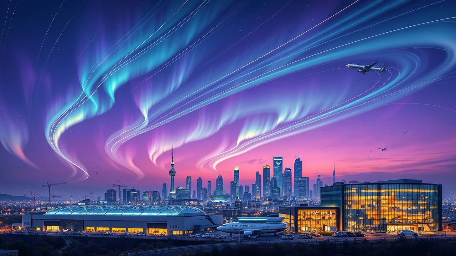 作图提示词:A dusk skyline of Shenyang’s aviation industrial park, bathed in an ethereal energy net resembling auroras. Ion trails gracefully write patterns across the twilight sky, forming a protective grid over the city. Modern hangars and research facilities stand below, their glass facades reflecting the celestial light show. The dominant colors are deep purples and electric blues with golden accents, conveying both technological might and poetic beauty. Photographic techniques include a panoramic view to capture the expansive skyline, long exposure to highlight the ion trails, and reflective surfaces to enhance the light play on the glass facades.