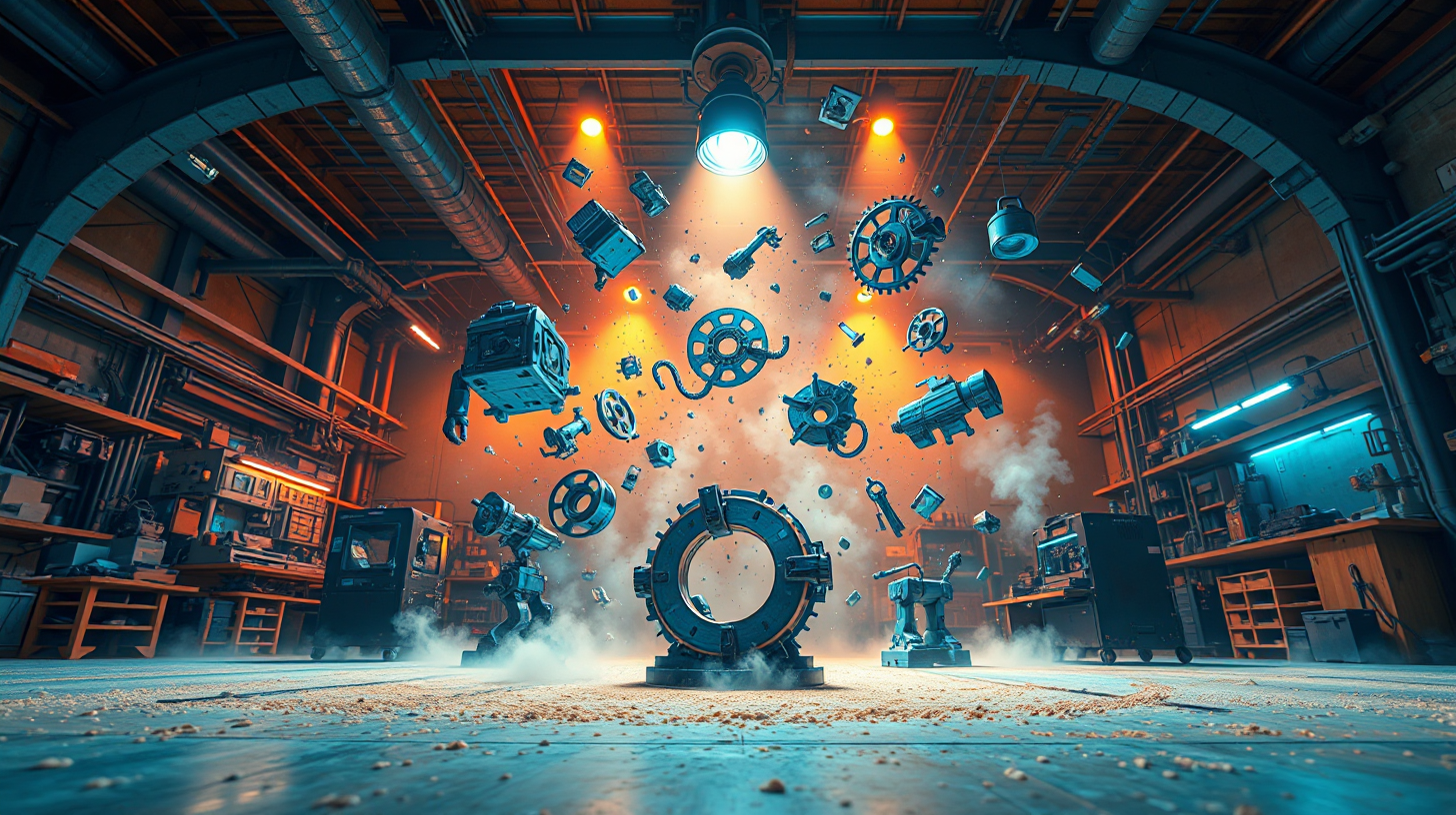 作图提示词:A dynamic low-angle shot inside a makerspace converted from an old factory, featuring a zero-gravity chamber where 3D printers autonomously recreate machine tool sculptures. Metal fragments float in mid-air, forming holographic projections of industrial history. Industrial-chic lighting with orange and steel blue tones, dust particles illuminated by work lights, futuristic workshop atmosphere. Shot with a wide-angle lens to emphasize space, high ISO for low-light clarity, motion blur on floating objects to convey movement.