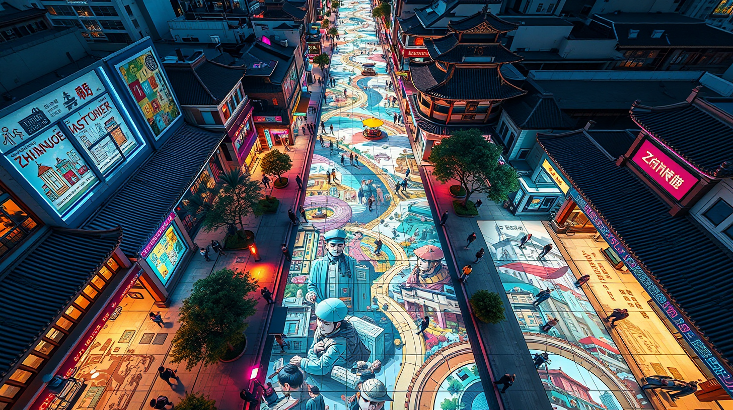 作图提示词:A stunning top-down view of Zhongjie Pedestrian Street where pressure-sensitive tiles activate ground projections of the city’s history, from Qing Dynasty origins to modern tech, triggering different eras. Neon-lit urban landscape with traditional architectural elements, vibrant colors highlighting the narrative. Captured with a drone, bird’s-eye perspective, deep depth of field to keep all details sharp, long exposure capturing dynamic light changes in the projections.