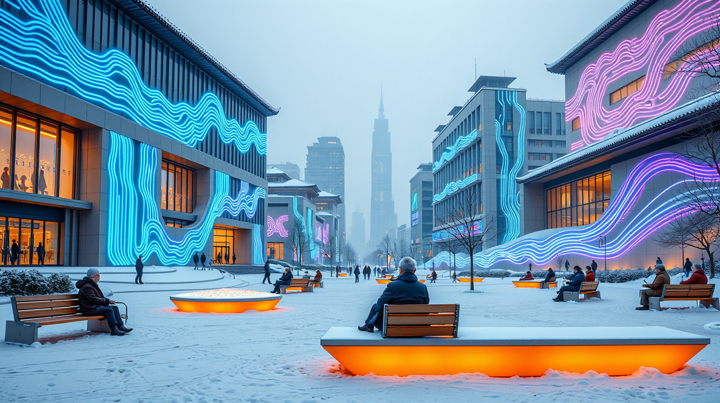 作图提示词:A futuristic winter scene in Shenyang, China, showcasing intelligent heating pipes on building facades that create aurora-like energy art. Elderly people relax on neural perception benches generating personalized warmth fields. The architecture combines modern designs with traditional Chinese elements, illuminated by glowing pipes weaving across surfaces. The scene features a contrast between soft blue and purple lighting from energy displays and warm orange hues from the benches, creating a serene yet technologically advanced atmosphere with faint hums of energy transfer. Photographic techniques include a wide-angle shot to capture the urban landscape, shallow depth of field to focus on the benches and pipes, and dynamic lighting to emphasize the contrast between cool and warm tones.