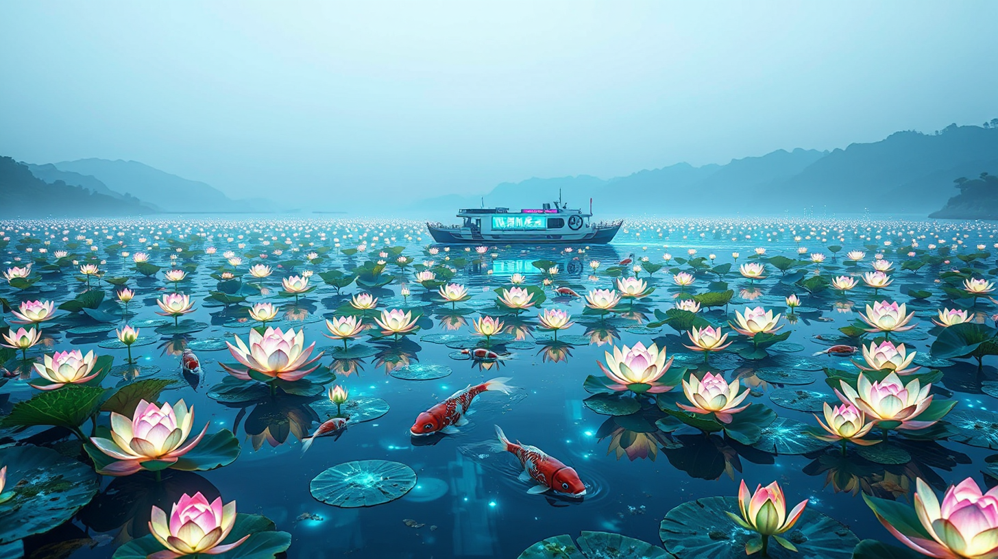 作图提示词:A serene mid-shot of Hun River surface covered with glowing LED lotuses that transform into real-time water quality displays as an environmental monitoring boat passes. Beneath the crystalline water, robotic koi fish assist in ecological balance. Soft blue lighting, cyberpunk aesthetic with traditional Chinese elements, ultra-high definition reflections on water surface. Framed with a 50mm prime lens for natural perspective, balanced exposure between LEDs and water, cool color temperature emphasizing the tech-meets-nature harmony.