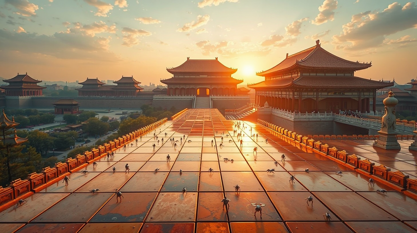 描述:清晨第一缕阳光穿透薄雾,唤醒沈阳故宫屋顶的纳米虫群。金色光粒如液态金属般在琉璃瓦上流淌,自动填补岁月留下的裂纹。屋檐下,全息投影的八旗士兵甲胄锃亮,正与晨跑的市民以虚拟箭术切磋,投影的弓弦震颤与真人的呼吸节奏在晨光中交织,上演一场跨越时空的文明对话。汉白玉栏杆凝结的晨露折射着纳米机器人的微光,古老宫灯与太阳能板在飞檐下相映成趣。