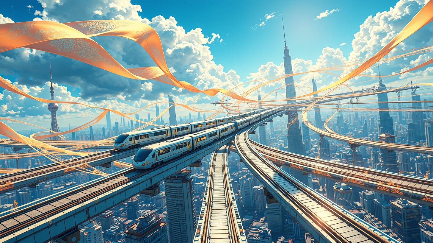 作图提示词:A futuristic cityscape with glowing silk-material tracks crisscrossing the sky, magnetic levitation trains gliding like silver shuttles through the air network, traditional Chinese silk patterns integrated into the high-tech transportation system, warm sunlight reflecting off the shimmering tracks, low angle view emphasizing the grandeur of the technological marvel against blue sky --ar 16:9 --v 6 --style raw