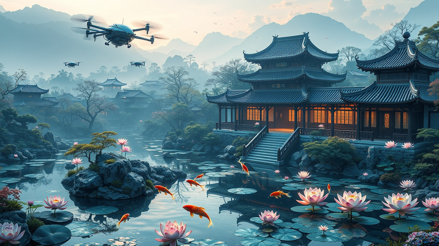 作图提示词:A futuristic Suzhou garden at dawn, with nanobot repair drones hovering over ancient rockeries and pavilions, quantum projection technology transforming the water surface into dynamic ink wash paintings of swimming koi fish and blooming lotus flowers, soft morning light filtering through traditional Chinese architecture, harmonious blend of ancient and futuristic elements, ethereal atmosphere, aerial view --ar 16:9 --v 6 --style raw