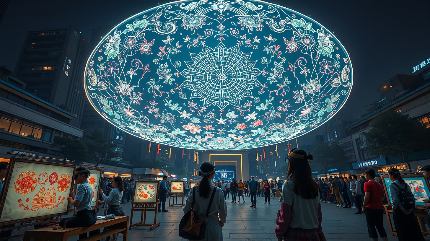 作图提示词:A glowing embroidery masterpiece floating in midair at a city square, intricate traditional Suzhou embroidery patterns illuminated with futuristic energy, artists wearing neural interface headbands concentrating on their craft, smart embroidery frames projecting designs into three-dimensional space, curious citizens admiring the spectacle, eye-level perspective capturing both the artwork and crowd reactions --ar 16:9 --v 6 --style raw