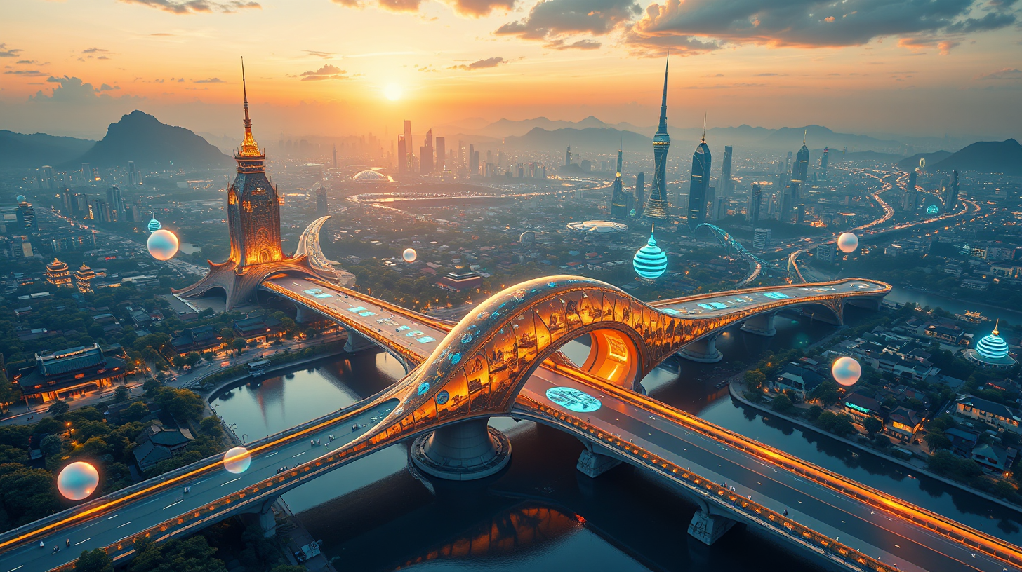 作图提示词:A breathtaking drone’s-eye view of Suzhou’s skyline at golden hour, showcasing the seamless integration of ancient gardens and futuristic spires. The self-repairing graphene bridge shimmers like liquid silk, its adaptive surface displaying interactive holograms of historical events. Warm amber lighting accentuates the bridge’s organic curves, while the city beyond glows with cool bioluminescent blues. The composition uses leading lines from waterways to guide the eye toward the central bridge structure, with depth enhanced by atmospheric perspective and subtle lens flare from floating light orbs.