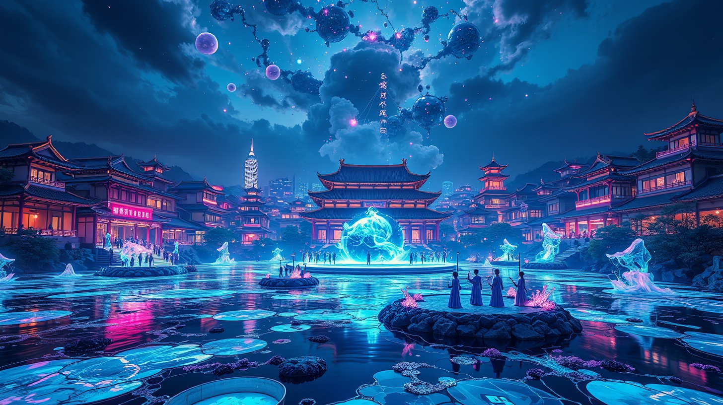 作图提示词:A cyberpunk-inspired Suzhou cityscape at night, where nanotech-enhanced traditional Chinese architecture coexists with floating holographic stages. Quantum projection technology transforms the water surfaces into dynamic ink paintings, while neural-linked performers blend Pingtan opera with electronic music. The scene features a vibrant color palette dominated by bioluminescent blues and purples, with atmospheric lighting from floating nano-particle displays. Shot with an ultra-wide lens to capture the full depth of the performance space, using long exposure techniques to emphasize the movement of light and energy.