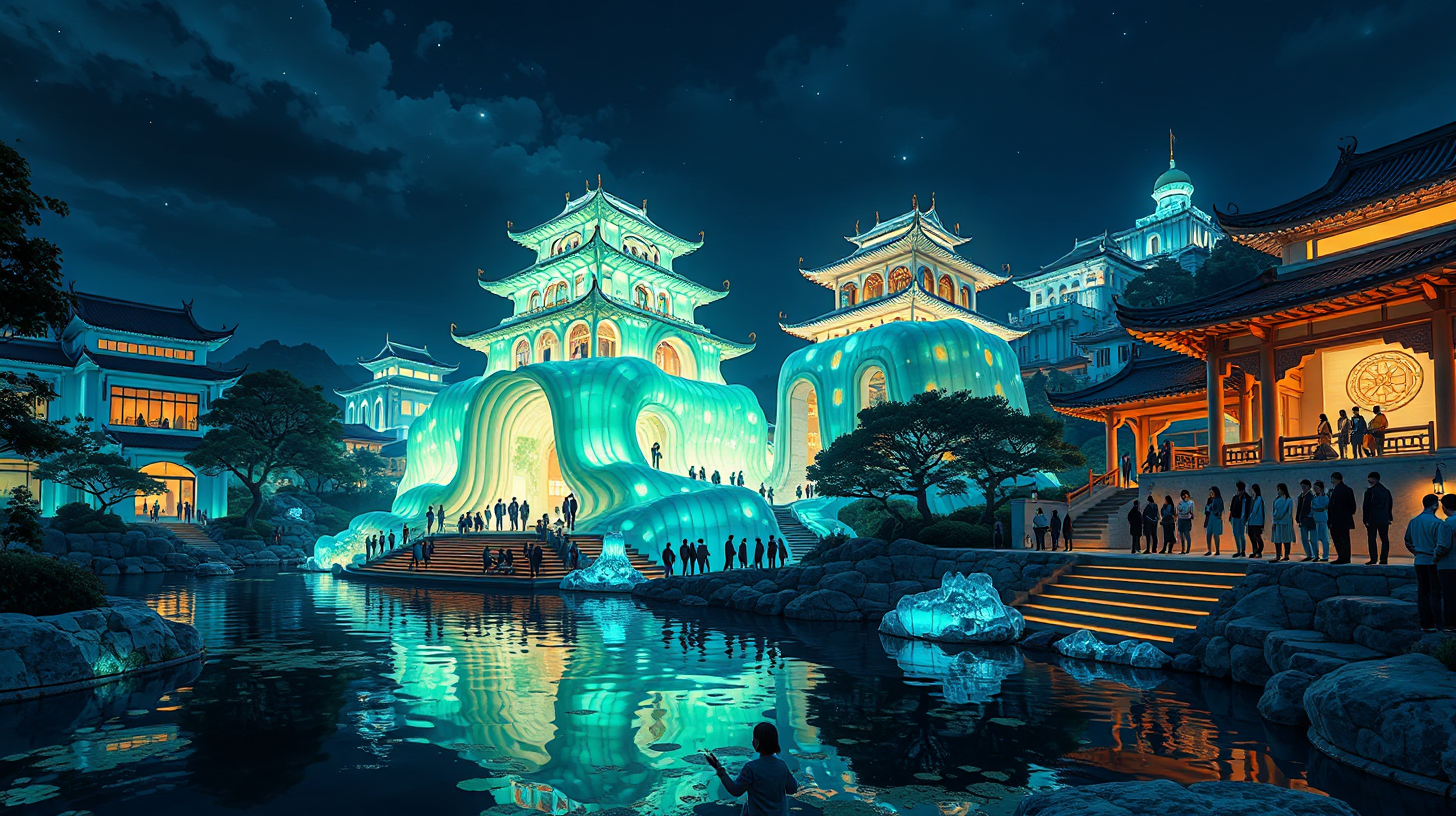 作图提示词:A Suzhou garden at night with bioluminescent architecture that breathes and pulsates, building facades undulating like living organisms, soft glowing lights changing colors in sync with visitors’ emotions, traditional pavilions transformed into luminous sculptures, dark water surfaces reflecting the dynamic light show, side view capturing both architecture and mesmerized spectators --ar 16:9 --v 6 --style raw