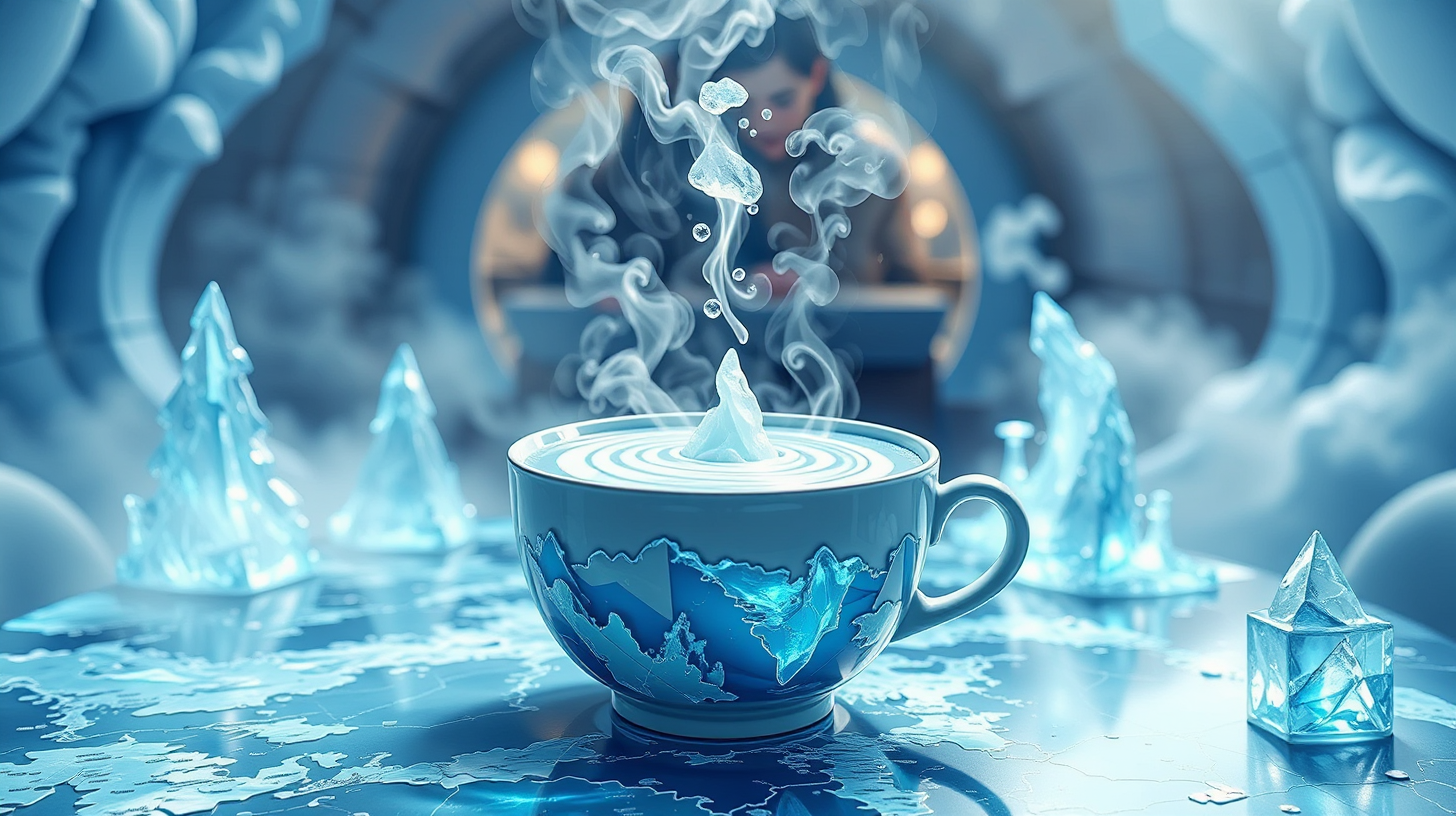 作图提示词:An exquisite close-up of a smart iceberg tea pavilion, featuring a temperature-controlled ceramic cup generating mesmerizing sea mist latte art. Holographic nautical maps on the table surface allow visitors to embed memories into growing ice sculptures. The scene is rendered in cool blue and white tones with delicate vapor effects. Ultra-detailed macro photography style with emphasis on the intricate patterns formed by the rising mist, using a macro lens to capture fine details, with diffused lighting to enhance the softness of the mist and cool color tones to emphasize the icy theme.