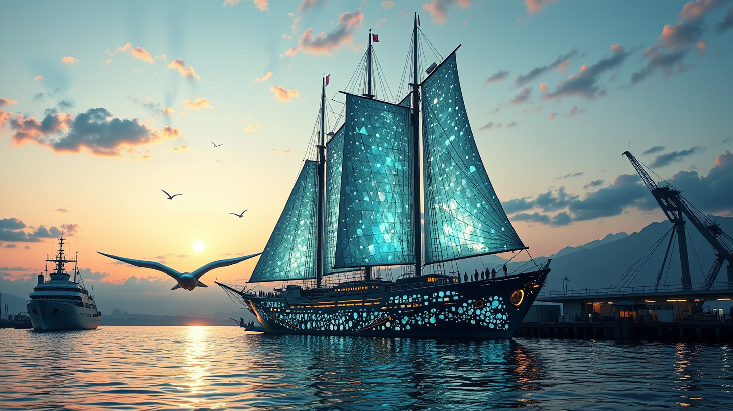 描述:星轨造船厂的黄昏里,一艘帆船静静停泊,船身镶嵌的贝母芯片闪烁着幽蓝光芒,记录着百年航海的风浪与荣光。机械臂与量子3D打印机正协作组装新的船体,船舷传来空灵的旋律——那是芯片中沉睡的航海故事在低吟。不远处,新下水的科考船展开仿生蝠鲼翼膜,如巨鸟般准备拥抱无垠深海。