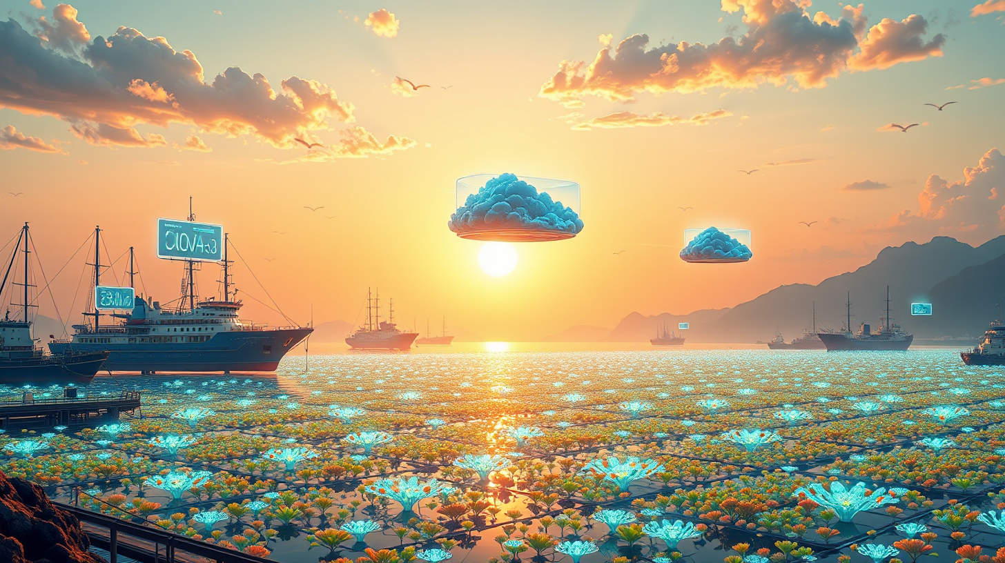 描述:金色余晖浸染智慧渔港,磁悬浮渔船如银色飞鱼滑过水面,船身流淌的数据流化作璀璨光带,汇入云端渔场的数字海洋。年轻的海藻建筑师戴着生物触控手套,指尖划过之处,发光磷虾群如星尘般编织出立体养殖网,科技的冷光与生物的暖辉在此交织,奏响一曲未来渔业的和谐交响。