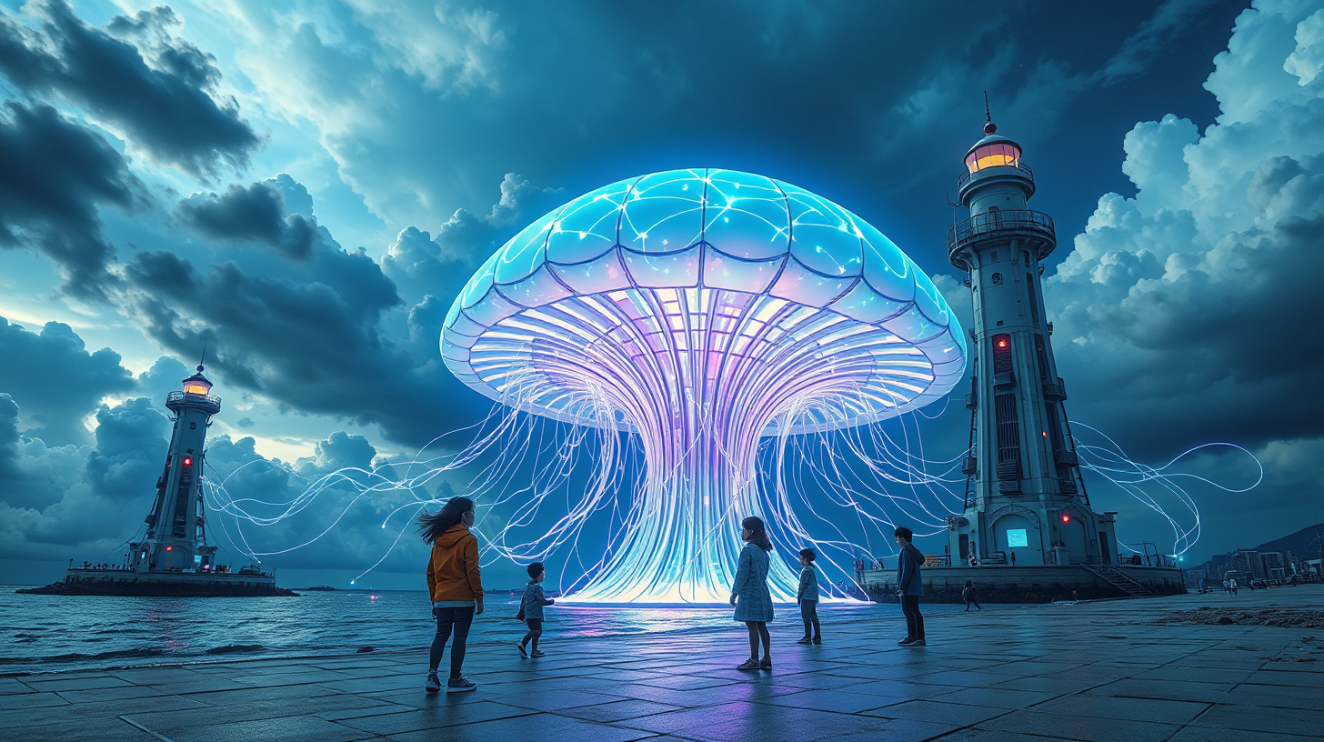 作图提示词:A futuristic coastal scene in Dalian, China, where towering lighthouse robots unfold plasma barriers forming a giant jellyfish-shaped protective dome. The translucent energy shield ripples with vibrant blue and purple light streams, casting an ethereal glow on the excited children safely observing from below. Dramatic storm clouds gather in the background as the plasma filaments weave intricate patterns against the darkening sky. Cinematic side view with low-angle perspective emphasizing the monumental scale of the technological marvel, featuring advanced 22nd-century materials and holographic interfaces.