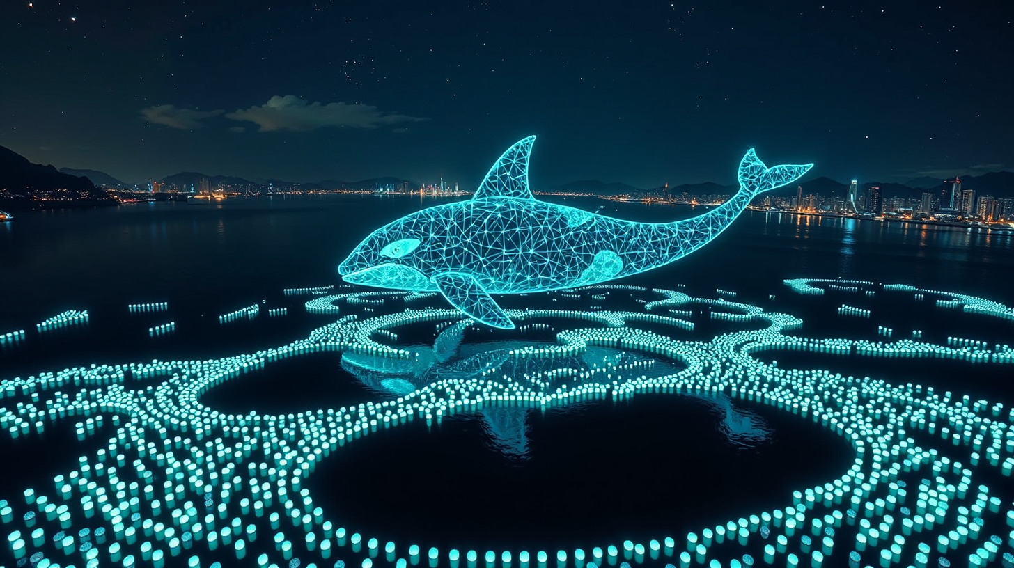 作图提示词:A breathtaking night scene over Dalian harbor, where thousands of bioluminescent buoys form a dynamic current map on the dark water surface. The glowing markers gradually assemble into the shape of a majestic orca constellation in the sky, their soft blue-green light reflecting on the calm sea. Aerial view captures the mesmerizing geometric patterns transforming into the celestial marine mammal, with the futuristic city lights twinkling in the background. Ethereal and hopeful atmosphere with magical realism style, showcasing sustainable 22nd-century marine technology and eco-friendly urban lighting.