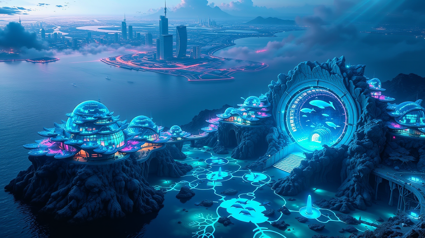 描述:晨光为大连湾镀上金边,纳米修复的珊瑚建筑群如呼吸般随潮汐脉动,蓝紫色生物荧光在海水中流淌。海底隧道穹顶投射出量子光谱组成的虎鲸全息图腾,巨影在清澈海水中游弋,唤醒城市与海洋千万年的共生记忆,光影交错间,科技与自然谱写出神秘的觉醒乐章。
