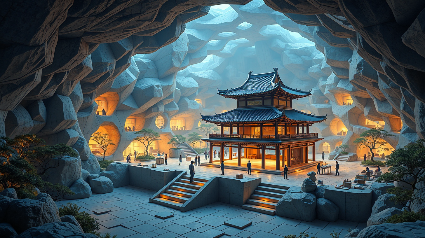 作图提示词:A futuristic creative workshop inside the unfolded topological structure of Taihu rocks in Liuyuan Garden, Suzhou. Programmable matter is being used by makers to reconstruct the Canglang Pavilion, with each brick containing memory data of Suzhou artisans. The scene is viewed from an aerial perspective, showcasing the intricate details of the transforming architecture and the glowing data streams embedded in the materials. The lighting is soft and ambient, with a mix of cool blues and warm golds highlighting the fusion of technology and tradition. The mood is innovative and awe-inspiring, capturing the moment of cultural preservation through advanced technology.