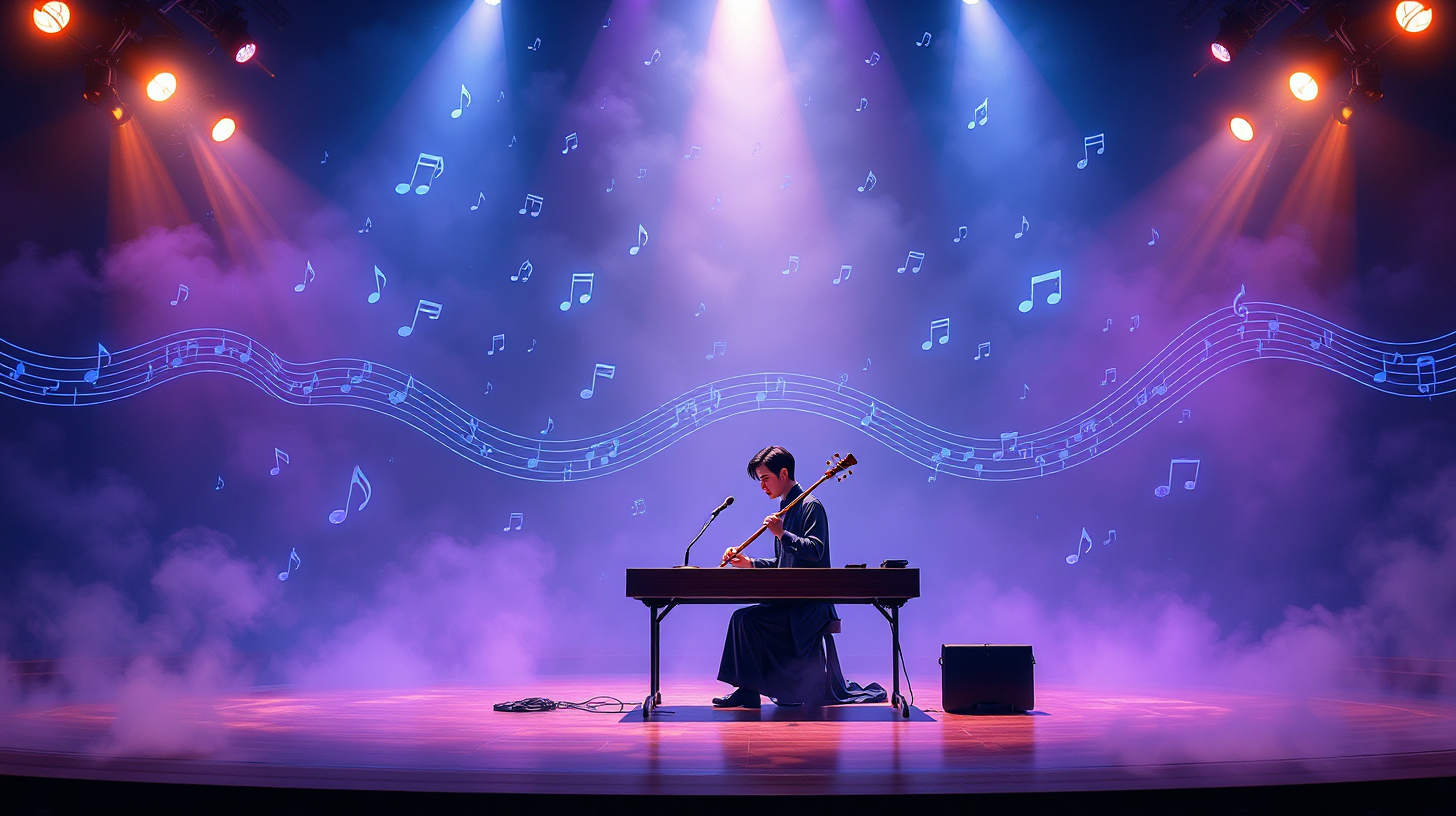 作图提示词:A low-angle medium shot (50mm) of a holographic opera stage where quantum-composed melodies manifest as visible soundwaves through morning mist. Shot at f/2.2 to render both the physical sanxian player and holograms in focus, with mist diffusing the purple-blue light emissions. The composition uses rule of thirds to balance the musician with floating musical notation projections. Lighting contrasts warm traditional stage lights with cool holographic glows, captured at 1/60s to slightly blur the performer’s movement.