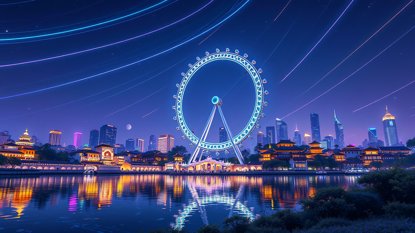 作图提示词:A breathtaking night view of Jinji Lake in futuristic Suzhou, where the Ferris wheel has transformed into a star-ring-shaped observatory. The ancient city walls glow with luminous algorithmic poetry, while the urban core weaves visitors’ smiles and artisans’ wisdom into digital Suzhou embroidery projected onto cloud server clusters. The scene is captured from a low-angle perspective, emphasizing the grandeur of the celestial observatory against the neon-lit cityscape. The color palette features deep purples and electric blues with golden accents, creating a mesmerizing contrast between cutting-edge technology and timeless tradition. The atmosphere is magical and futuristic, with light trails streaking across the night sky.