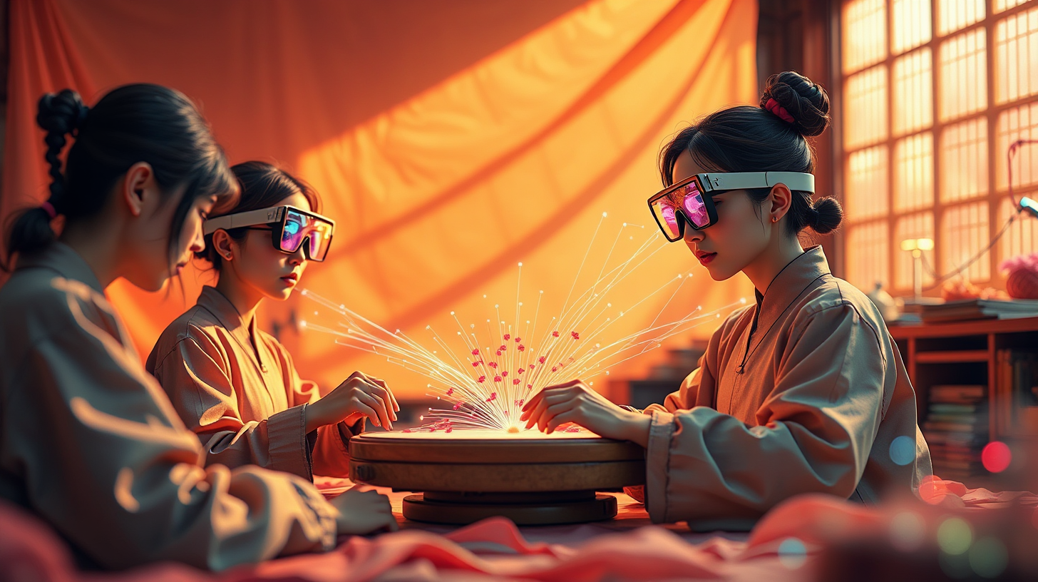作图提示词:An intimate mid-shot (35mm lens) of a Suzhou silk workshop where artisans wearing AR glasses collaborate with AI embroiderers. Warm directional lighting (5600K) highlights the rich silk textures while holographic thread projections add vibrant color accents. Shot at f/4 for balanced depth, showing both the physical embroidery details and AR overlays in sharp focus. The composition uses leading lines of silk threads to draw attention to the human-AI interaction point.