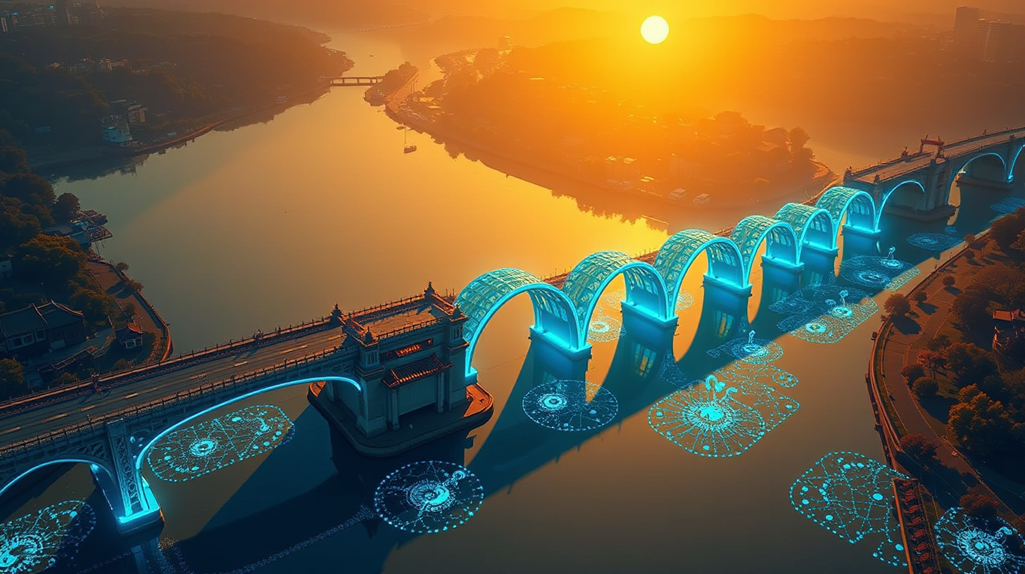 作图提示词:A golden hour aerial view (drone shot at 24mm) of Baodai Bridge’s 53 glowing blue arches activating nanobot water purification. Shot at f/8 with 1/125s shutter speed to capture both the bridge’s reflection and nanobot patterns. The composition balances the historic bridge structure with dynamic nanobot formations, using complementary orange-blue color grading. Long shadows emphasize the three-dimensional quality of the nanobot formations in the canal.