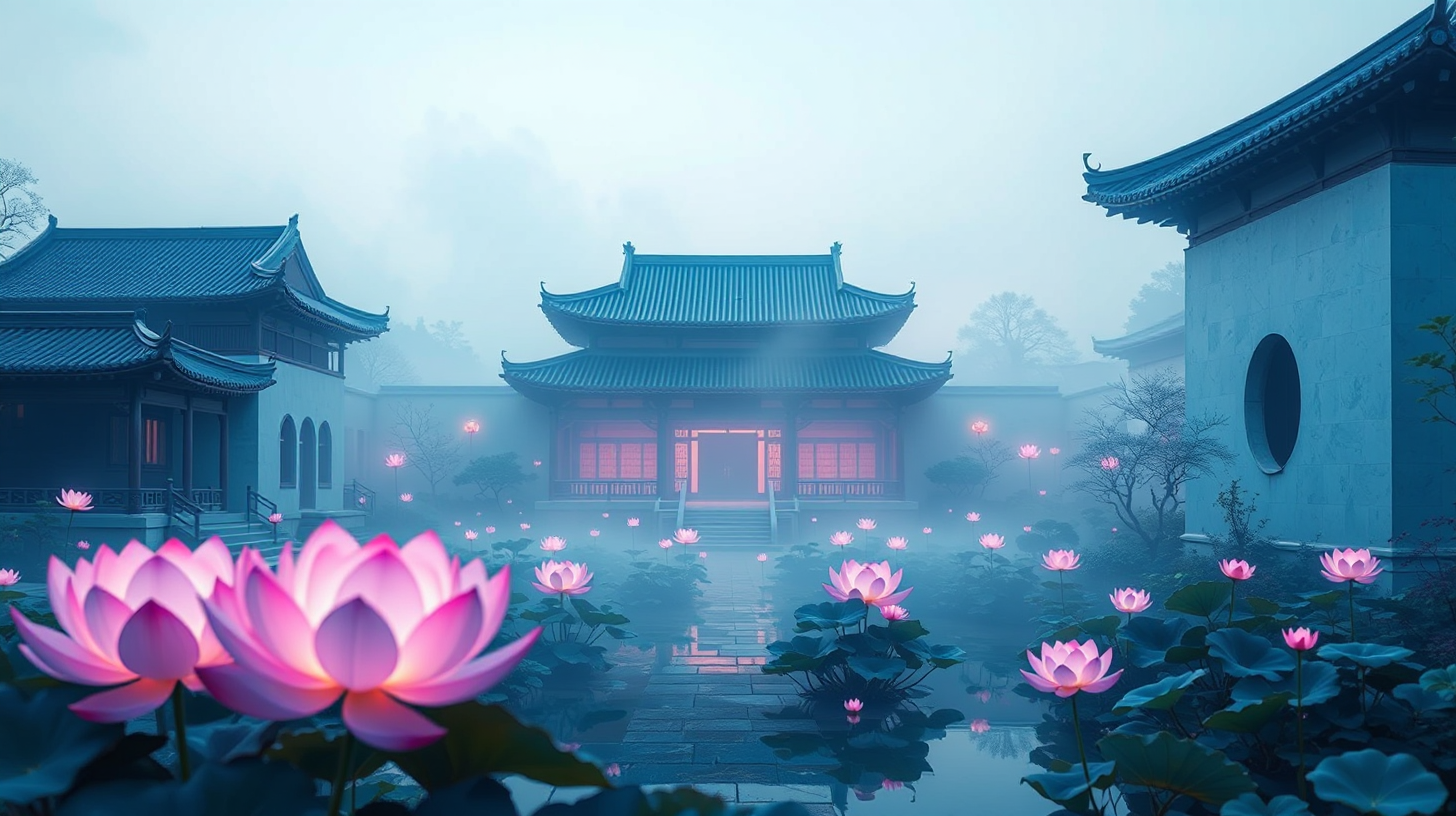 作图提示词:A dawn-lit classical Suzhou garden with self-regulating nanotech walls creating microclimates, featuring holographic winter lotus projections glowing softly in morning mist. Shot with a medium telephoto lens (85mm) at f/2.8 for shallow depth of field, emphasizing the floating holograms against softly blurred traditional architecture. Cool blue morning light contrasts with warm pink hologram hues, captured in a wide aspect ratio (2.35:1) to showcase both architectural details and technological elements.