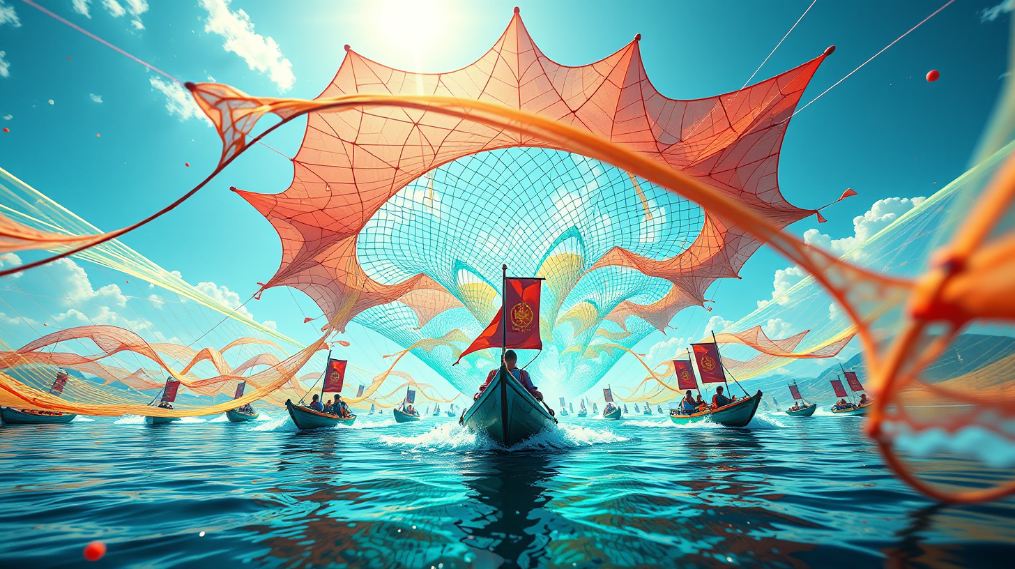 作图提示词:A dynamic low-angle shot of the 2180 Dragon Boat Festival, where AI-powered vessels with adaptive hydrofoils transform into rescue configurations. The composition uses leading lines from unfolding photoelectric nets to guide the eye, with high-speed sync freezing the action. Lighting combines midday sun with the boats’ pulsating photon emissions, creating vibrant color contrasts against the water. The image employs telephoto compression to emphasize the density of formations, with selective focus highlighting central boats while maintaining detail in the transforming net structures.