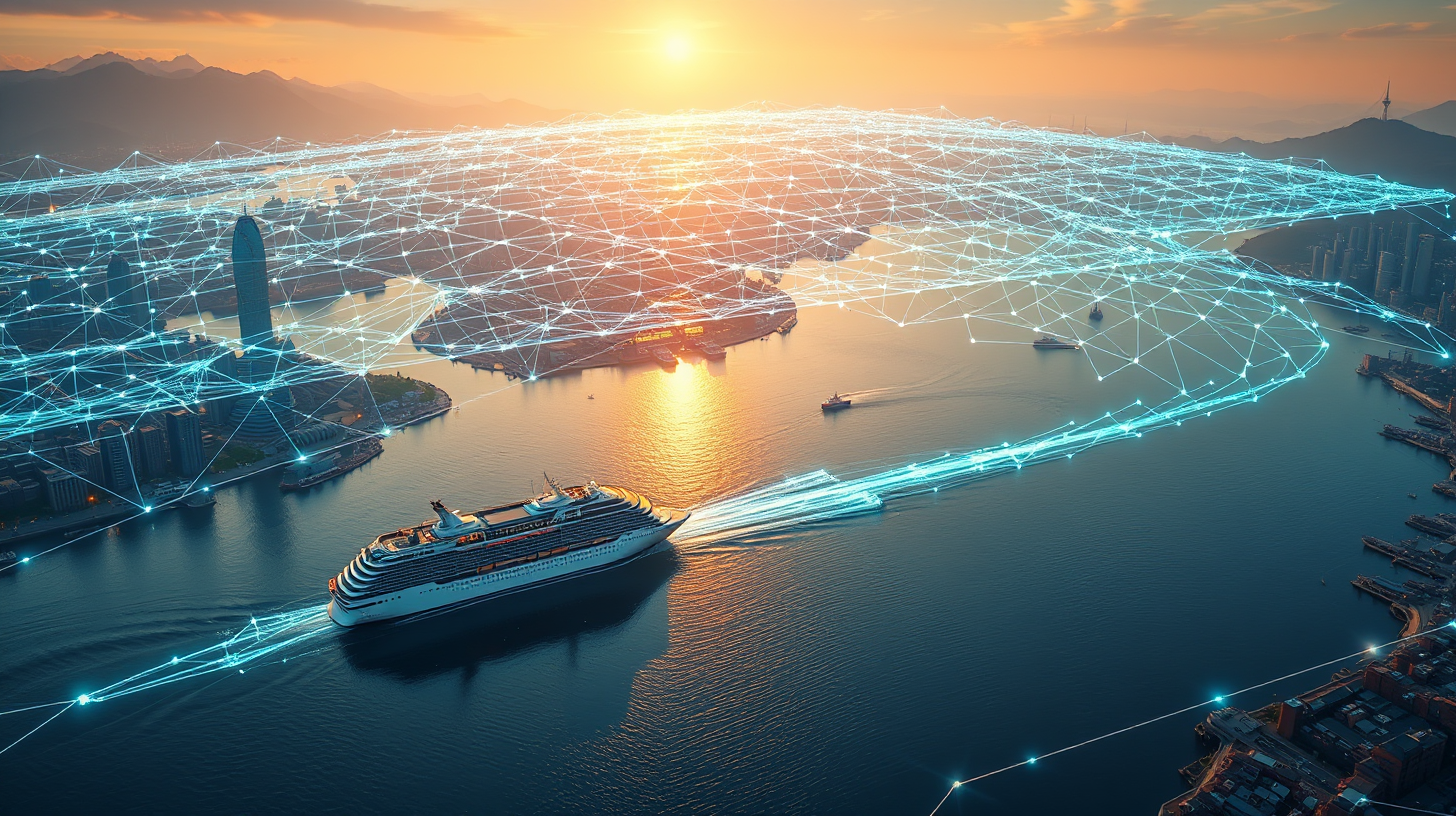 作图提示词:A breathtaking aerial view of Victoria Harbour at dawn in 2180, with an advanced photon grid forming a three-dimensional light network above the water, casting dynamic prismatic reflections. A quantum-powered cruise ship glides through, generating chromatic energy ripples that interact with the grid, creating an ever-shifting luminous tapestry. The composition uses a wide-angle perspective to emphasize the harbor’s scale, with shallow depth-of-field focusing on the energy patterns. Lighting combines dawn’s golden hues with the grid’s cool bioluminescent glow, rendered in a hyper-realistic cinematic style with HDR enhancement.