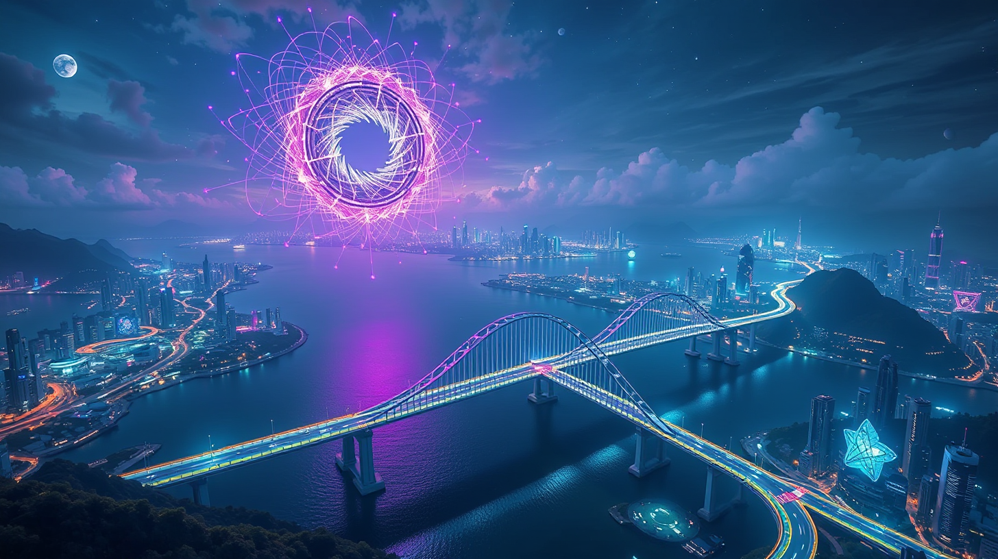 作图提示词:A breathtaking aerial view of the Hong Kong-Zhuhai-Macao Bridge at night, featuring a colossal starburst-shaped particle collider observatory hovering above. The observatory emits swirling energy patterns that connect to a neural network of light spanning the entire Greater Bay Area. The bird’s eye perspective highlights the bridge’s serpentine form, illuminated by bioluminescent railing, while the observatory’s ring structure pulses with violet and magenta plasma energy. Futuristic city clusters on both sides project holographic murals into the sky, creating an ultra-detailed sci-fi landscape with atmospheric glow. The composition uses a high-angle shot to capture the vast scale, with a balanced mix of cool and warm lighting to enhance the futuristic vibe. The depth of field is kept sharp to detail the intricate structures and energy patterns.