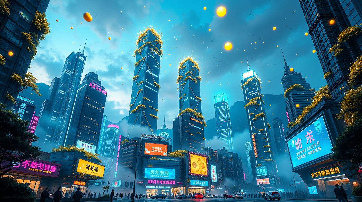 作图提示词:A futuristic Hong Kong Central district skyline at dusk, featuring towering skyscrapers adorned with glowing quantum moss that emits radiant energy. The moss transforms carbon dioxide into shimmering memory capsules, which float like fireflies around the neon-lit financial hub. Captured in an ultra-wide shot from ground level looking up, the scene showcases vibrant neon blues and cyans contrasting with warm golden light from the capsules. The cyberpunk atmosphere is enhanced by misty air refracting the colorful lights, with highly detailed futuristic architecture and holographic advertisements in Chinese characters. The composition emphasizes the grandeur of the skyline with a deep depth of field, dramatic lighting from the neon and capsules, and a color palette that blends cool and warm tones for a dynamic visual impact.