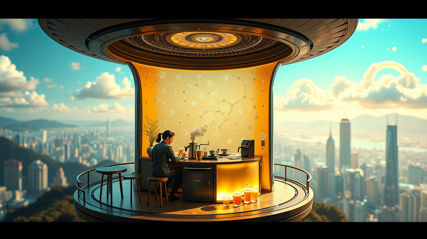 作图提示词:A medium shot of an anti-gravity tea pavilion suspended above Victoria Peak in 2180, where baristas with neural implants adjust quantum-state milk tea molecules via holographic interfaces. The composition employs rule-of-thirds framing with the pavilion offset against panoramic city views. Lighting features diffused bioluminescence from quantum dots in the walls, complementing the warm glow of brewing equipment. Shallow depth-of-field isolates the central tea preparation while nanotech clouds outside project fractal emotion visualizations in the bokeh background.