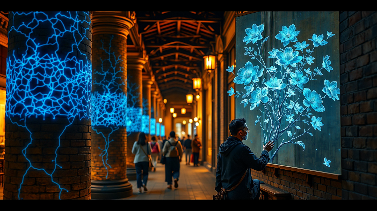 作图提示词:Pulsating neural-like blue light bands illuminate between the columns of century-old arcade buildings in Guangzhou’s historic district, 2145 AD. When touched by visitors, these photonic interfaces project immersive holographic histories of the architecture. A Cantonese master craftsman weaves quantum nanofilaments into floating holographic embroidery patterns where kapok flowers dynamically bloom and narrate Lingnan folktales. Warm ambient LED lighting highlights the textural contrast between weathered brickwork and glowing high-tech elements, captured in a medium shot with balanced golden ratio composition. Shot at f/2.8 to create bokeh effects on background elements while keeping main subjects sharp.