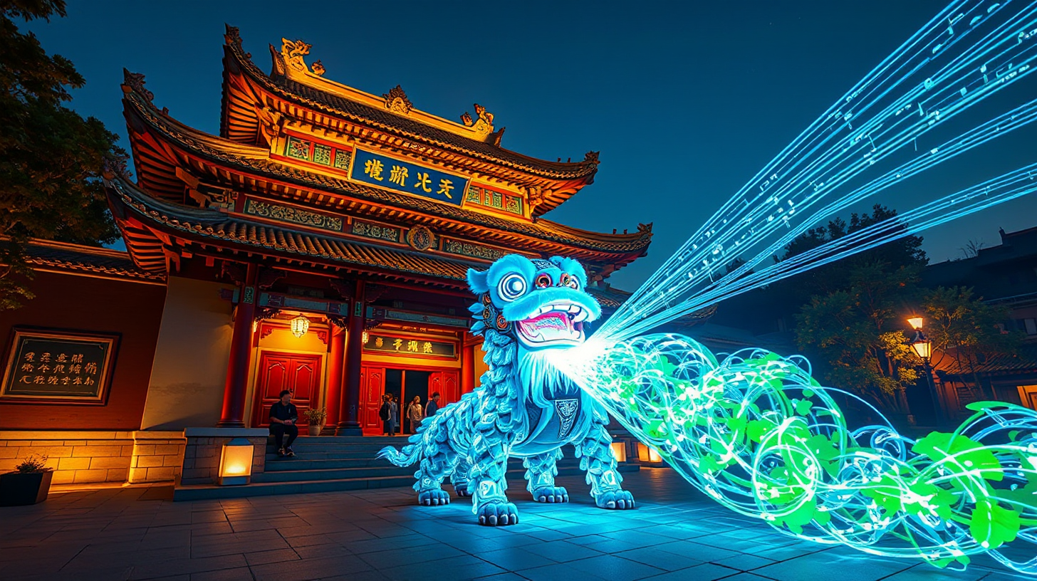作图提示词:At the entrance of Chen Clan Ancestral Hall in 2145 AD, a drone-formed lion dance troupe performs a futuristic digital cai qing (vegetable picking) ritual. Photon lettuce emitted from the lion’s mouth transforms into real-time data streams visualizing Guangzhou’s urban energy flow patterns. The scene combines traditional temple architecture with pulsating digital light projections, captured in a wide shot (16mm) at twilight with long exposure (2 seconds) to emphasize light trails. Composition balances the historic structure with technological elements, using leading lines from the architecture to guide the viewer’s eye. Color contrast between warm temple lighting and cool digital blues creates visual tension.