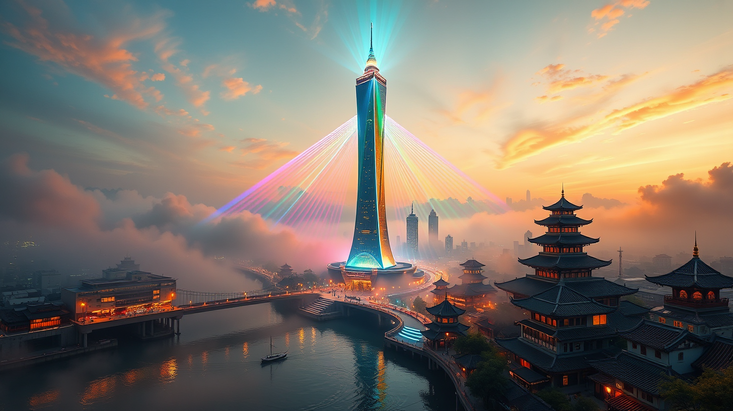 作图提示词:A futuristic dawn scene at Canton Tower in Guangzhou, 2145 AD, with quantum prisms on the tower’s peak refracting morning light into a dynamic rainbow spectrum across the Pearl River. Holographic dim sum aromas from floating teahouses activate bioluminescent street lamps, creating an interactive glowing pathway through the historic Xiguan district. Ethereal morning mist blends with vibrant light reflections, captured in an ultra-wide aerial view with a 12mm lens, showcasing the fusion of cutting-edge technology and traditional architecture in soft golden sunrise hues. Composition follows the rule of thirds with the tower as focal point, using atmospheric perspective to enhance depth.