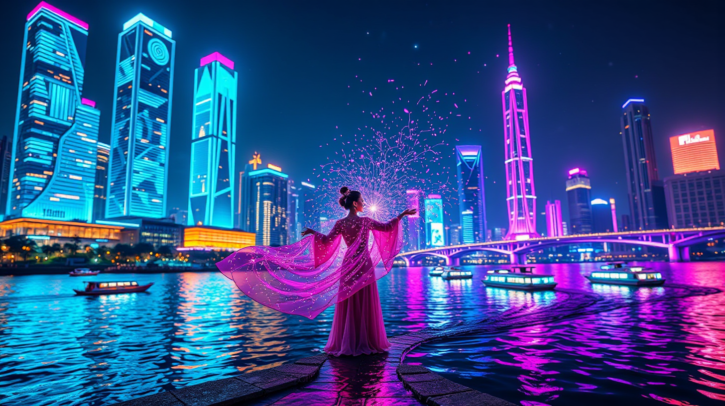 作图提示词:A breathtaking futuristic nightscape along Guangzhou’s Pearl River, where skyscraper facades transform into dynamic emotional spectrum walls that shift colors based on mood. A traditional Cantonese opera performer’s fluid sleeve movements generate dazzling particle resonance with the bioluminescent light trails of autonomous boats gliding across the water. Neon reflections dance on the river’s surface in vibrant hues of electric blue, holographic purple, and quantum pink, illuminating the hybrid architecture that blends neo-futurism with Lingnan cultural motifs. The atmosphere crackles with energy as photonic particles hover like techno-fireflies, captured with a wide-angle lens to emphasize the urban scale, using long exposure for light trails and shallow depth-of-field to focus on the performer’s intricate movements against the glowing cityscape.