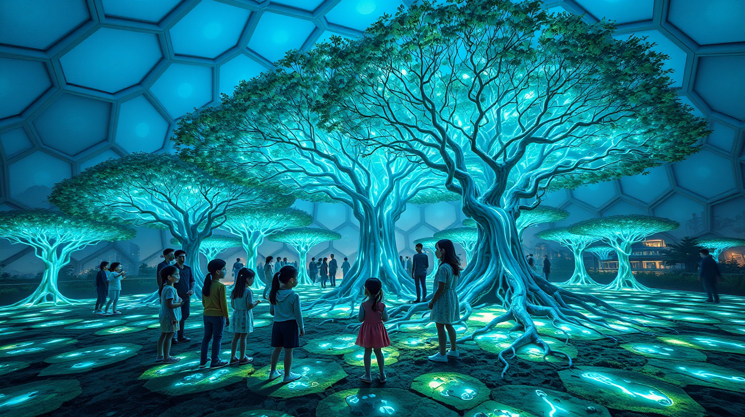 作图提示词:Within a colossal geodesic eco-dome at Baiyun Mountain’s base, curious children interface with luminous banyan trees whose pulsating aerial roots channel streams of city memory data in liquid light form. The transparent smart soil emits a soothing cerulean glow as it facilitates neural data transfer, visible through macro photography that reveals the intricate root networks. The dome’s climate control systems hum softly in the background, their hexagonal patterns creating geometric shadows that interplay with the organic light patterns. Captured with a medium telephoto lens to compress the futuristic architecture with the biological elements, using high dynamic range to balance the bioluminescent blues and greens against the structural lighting, with selective focus drawing attention to the children’s wonder-filled interactions.