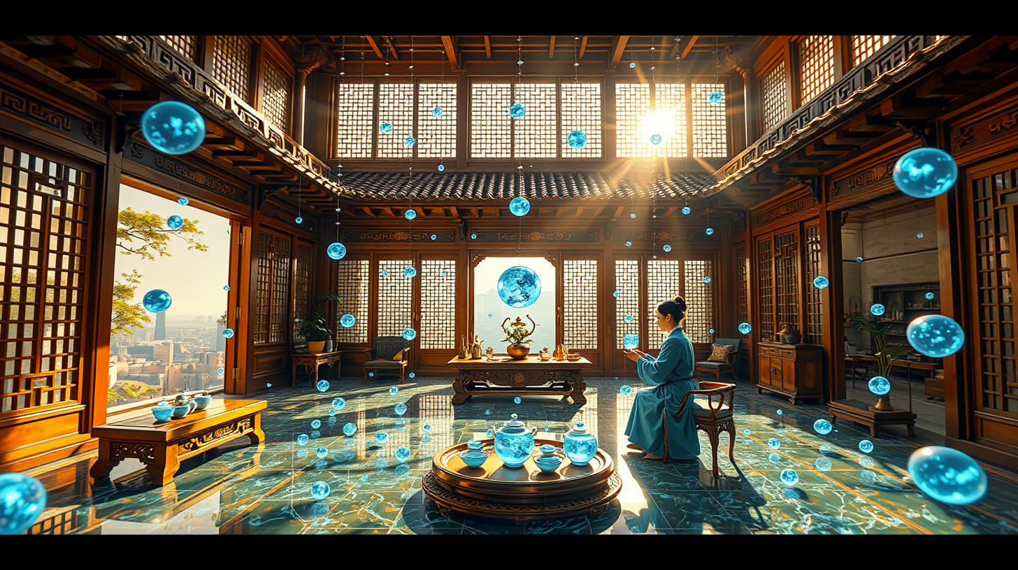 作图提示词:A gravity-defying Lingnan-style courtyard floats 300 meters above Guangzhou’s CBD in 2145 AD, where an AI tea master performs an elaborate kungfu tea ceremony using anti-gravity porcelain. Each falling tea droplet generates miniature holographic nebulas illustrating real-time data of historic Maritime Silk Road trade routes. The scene is bathed in golden afternoon light streaming through lattice windows, with intricate traditional wood carvings contrasting against futuristic transparent floors. Captured in a dramatic low-angle shot at 24mm with deep depth of field (f/11), emphasizing both the architectural grandeur and weightless quality. Color palette combines warm wood tones with cool blue energy accents.