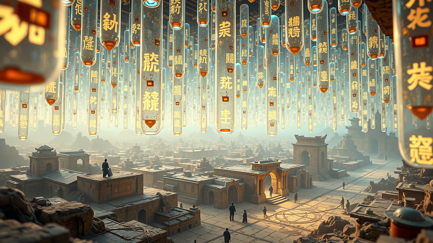 作图提示词:The Shangdu ruins area in futuristic Zhengzhou, suspended with thousands of holographic capsules adorned with intricate bronze patterns. Archaeological nanorobots meticulously transform newly discovered oracle bone scripts into shimmering three-dimensional light codes. The scene is bathed in a soft, ethereal glow that blends ancient bronze tones with modern neon light codes, creating a mesmerizing fusion of antiquity and cutting-edge technology. Aerial view capturing the delicate details of the holographic capsules and the dynamic, luminous process of light code formation, with a shallow depth of field to highlight key elements and a color palette balancing warm bronze and cool futuristic hues.