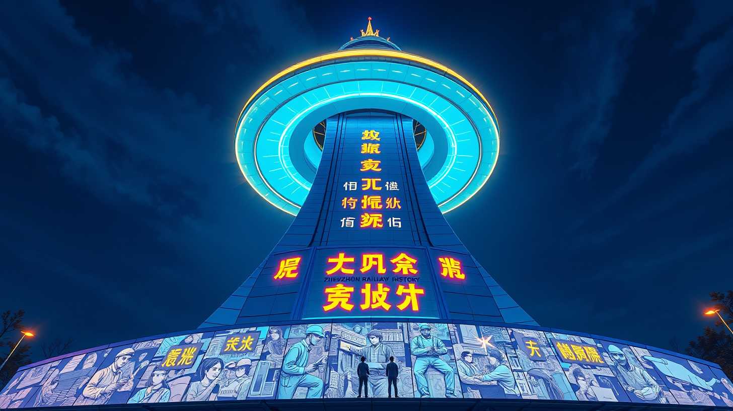 作图提示词:A dramatic low-angle night shot of Zhengzhou’s futuristic Erqi Memorial Tower, where a glowing star-ring-shaped quantum particle collider observation platform hovers above, projecting holographic dialogues between vintage railway workers and sleek quantum logistics robots. The tower’s facade features dynamic semantic reliefs that constantly rewrite ‘Zhengzhou Railway History’ in glowing calligraphy. Neon-lit quantum projections create vibrant light patterns across the scene, with a color palette of deep cobalt blues, electric golden yellows, and luminous violets. The composition uses Dutch angle for dynamic tension, with shallow depth of field focusing on the relief details while maintaining the tower’s imposing scale. Cinematic volumetric lighting emphasizes the high-tech yet historical atmosphere.