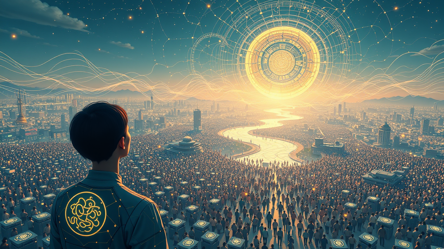 作图提示词:The annual city-wide brainwave resonance festival in futuristic Zhengzhou reaches its climax, with citizens wearing neural patches patterned after the ancient Hetu and Luoshu diagrams forming a massive, pulsating array. An emotional algorithm architect orchestrates the collective consciousness, reconstructing a breathtaking holographic epic of the Yellow River’s three millennia of course changes across the sky. The scene radiates celestial grandeur with intricate, swirling light patterns and an ethereal glow, symbolizing humanity’s technological升华. Bird’s-eye view capturing the vast neural network array and the emergent holographic epic, employing long exposure techniques to trace light movements and a cool-toned color scheme with strategic warm accents to highlight emotional focal points.